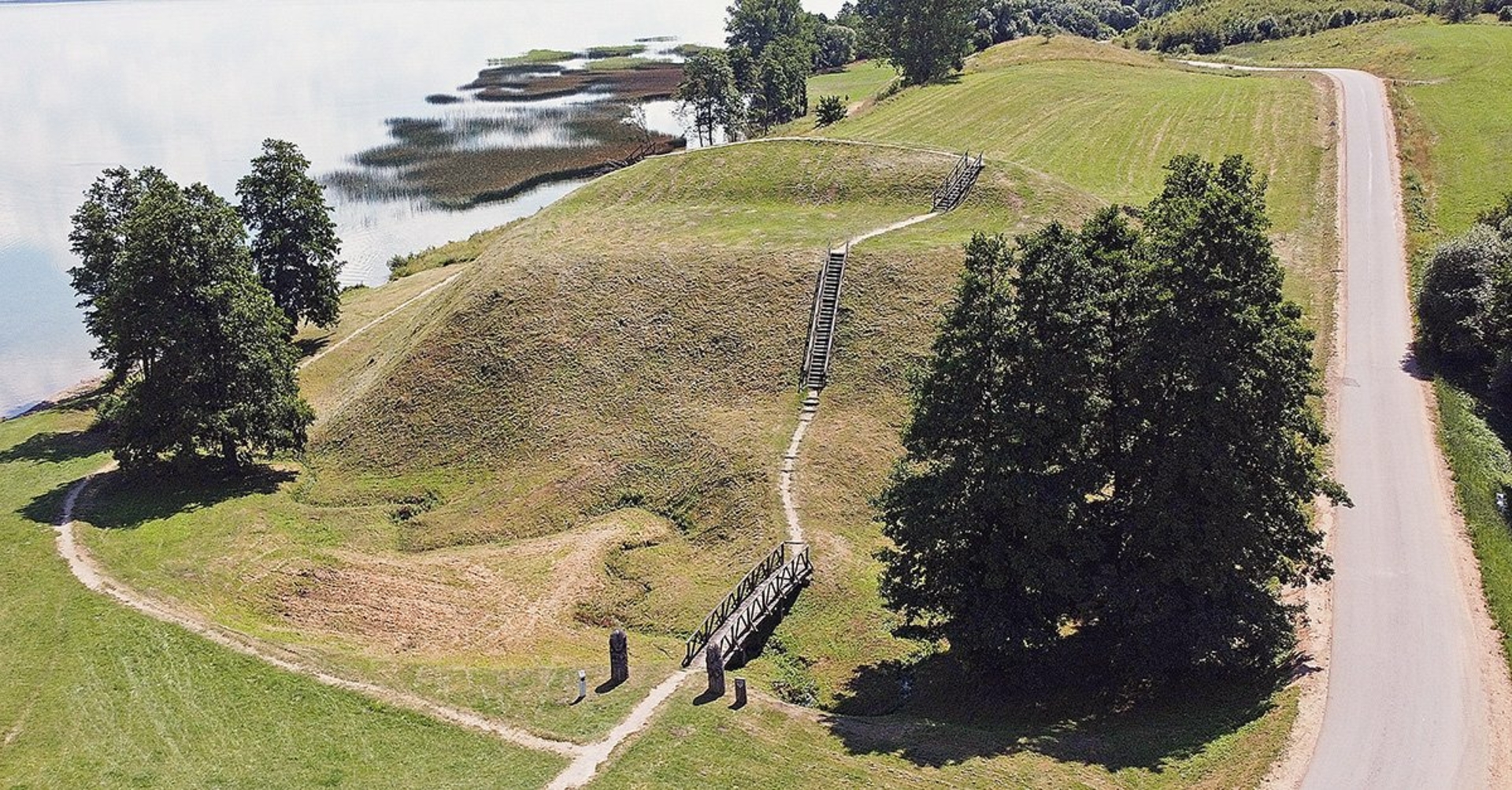 The Riečių Hillfort is located in the southern part of Riečių village, Gudeliai Eldership, within Marijampolė Municipality. It can be accessed via Road 181 from Seirijai to Simnas to Igliauka, passing through Riečių village and then turning right, 450 meters westward across wet meadows, beyond the canal. The hillfort is situated on a land promontory extending into the Žuvintas Marshes. The hillfort area is triangular in shape, elongated in a north-south direction, measuring 25 meters long and 20 meters wide at the southern end. The slopes of the hillfort are moderately steep, rising up to 10 meters high.