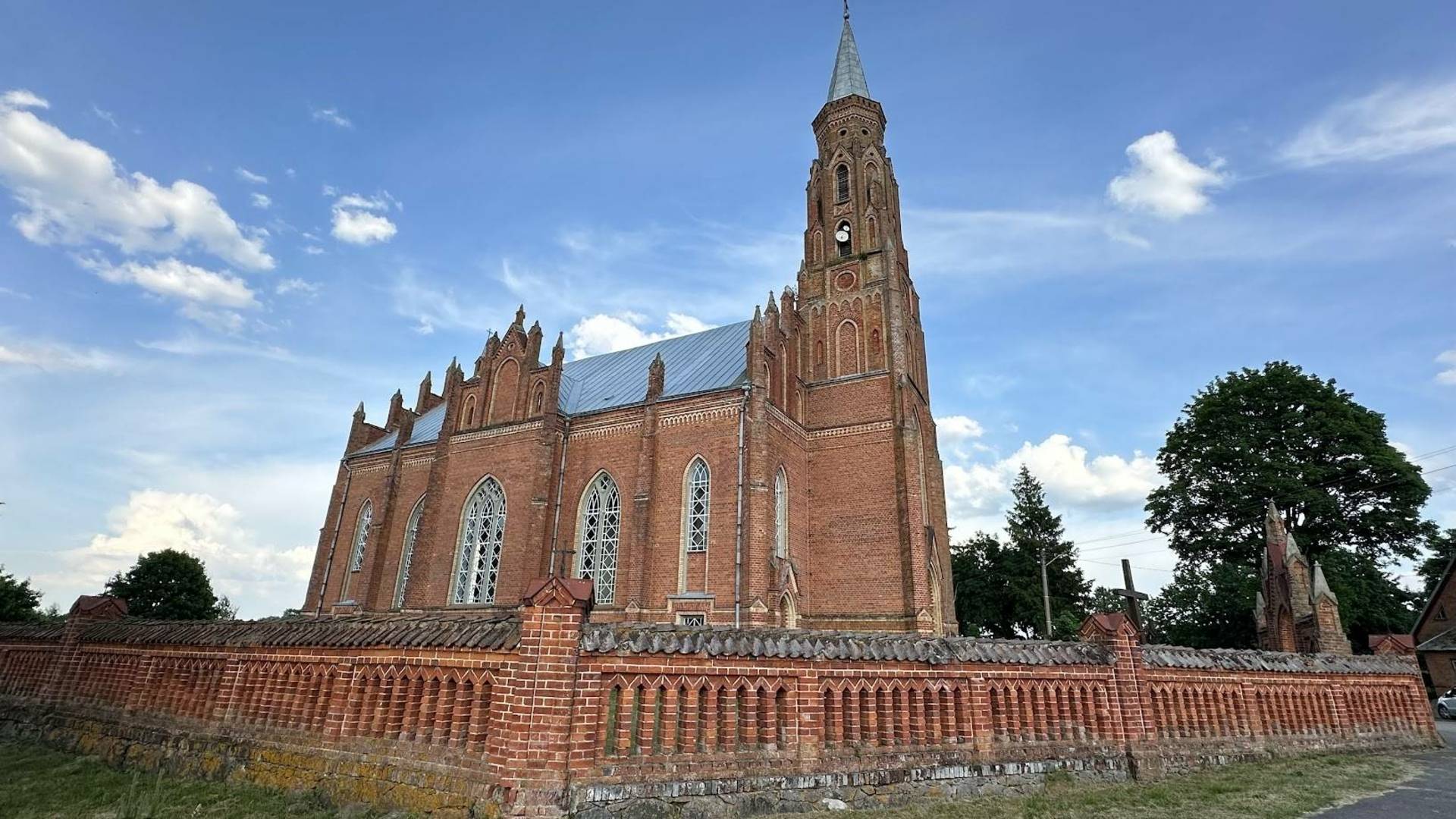 feature decorative grid patterns. The interior of the church follows a pseudo-basilica style, with the central nave’s ceilings being higher than those of the side naves. Semi-circular arch niches, imitating windows, are decorated with painted ornamentation. The narthex is separated from the central nave by square columns with carved corbels supporting the church’s choir. The interior furnishings are neo-Gothic, including intricate tracery around the windows and chandeliers. The bright central Crucifix altar and the pulpit, adorned with bas-relief carvings and a canopy, are particularly striking. Next to the church stands a tall rectangular belfry with a shallow pediment and an open gallery supporting a four-sided shingled roof. This roof is topped with a wrought-iron cross featuring an angel figure. Within the churchyard, which is part of the cemetery, there is a wooden chapel built by Kazimieras Mockus and Kazimieras Andreika. The chapel has a square shape with a hipped roof. The corners are decorated with profiled cladding, and the wide windows are framed with sawtooth-patterned moldings. The churchyard is enclosed by a stone masonry wall with wedge-shaped arched gates and side gate openings, forming an almost perfect rectangular perimeter.