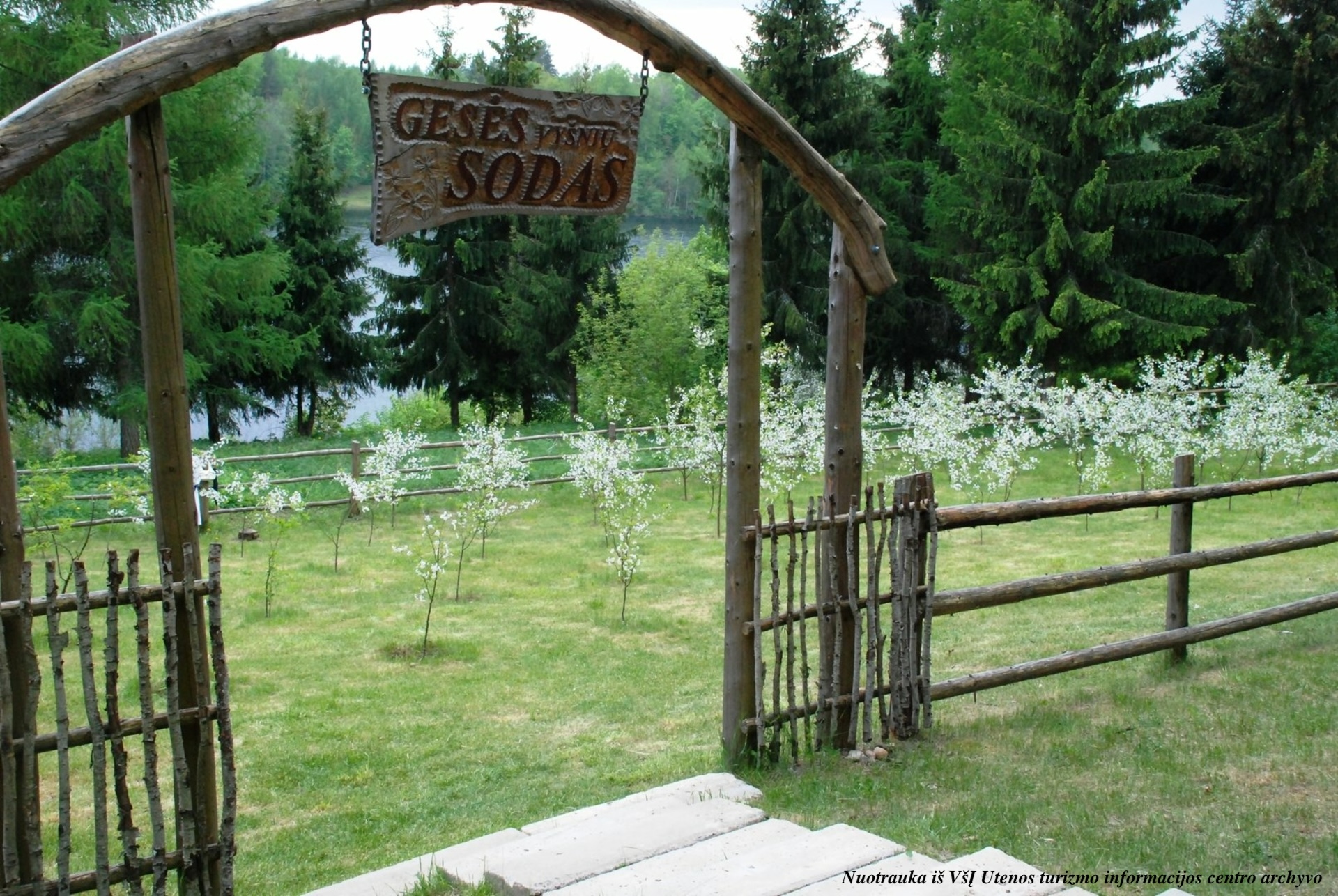 Dr. Eugenija Šimkūnaitė (1920–1996), a habilitated doctor of biological sciences, left an invaluable ethnocultural legacy to Lithuania through her work and life, creating lasting memories for those who knew her. This unique folk healer, born in Novorossiysk (Russia), spent most of her life in Tauragnai, where she now rests in eternal peace. While still alive, she expressed a wish for a cherry tree to be planted on her grave. To commemorate her memory, the "Gesės Cherry Orchard" was initiated by D. Kunčienė, president of the Herbalists Academy, near Lake Labė in 2012. The first cherry trees were donated by the Herbalists Academy, and the planting continued with the help of members of the E. Šimkūnaitė Foundation, the local community, and other enthusiasts. A local craftsman, R. Šimkūnas, created a gate for the orchard's enclosing fence with a distinctive inscription.