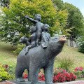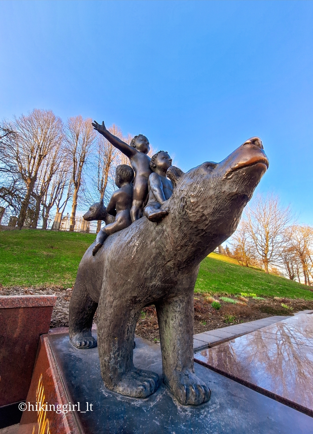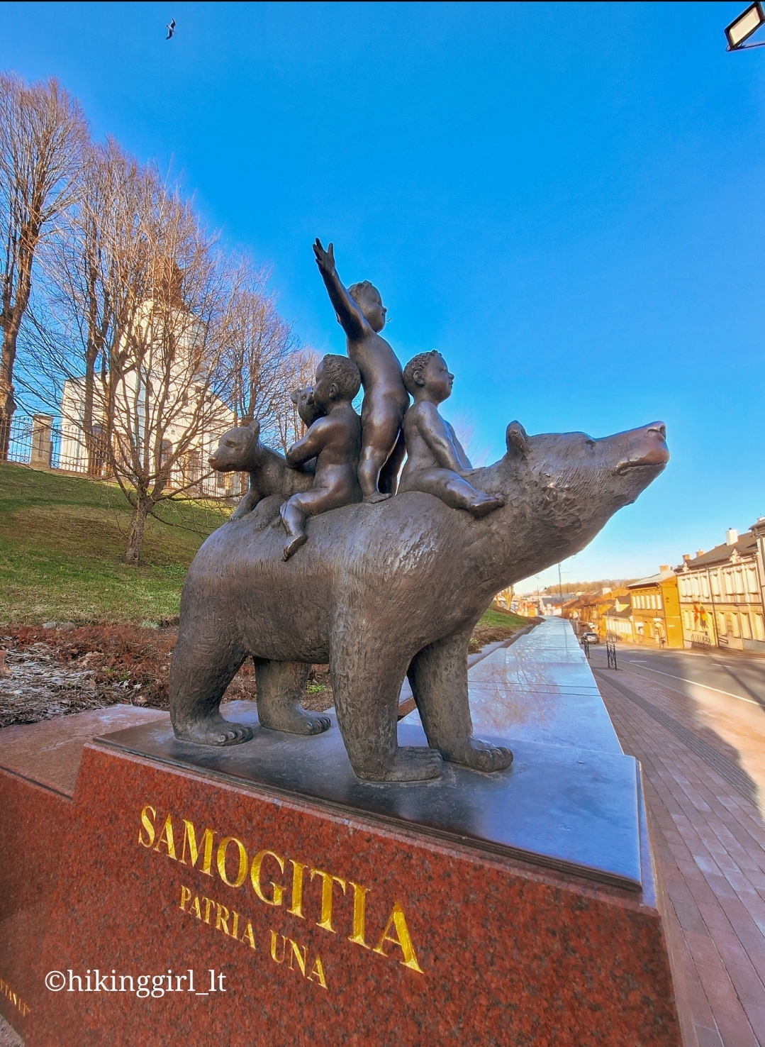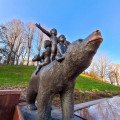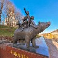 on the bear’s back represent three key areas of Samogitian strength: art and creativity, patriotism, and diplomacy. The first child embodies the contribution of artists and creators to the prosperity of Samogitia. The second is a patriot, protecting traditions and culture. The third, kissing the bear cub, symbolizes diplomacy and the ability to find solutions. The sculpture has another special feature – it is believed that gently rubbing the bear’s nose will make your wishes come true. This is evidenced by the shiny part of the nose, worn smooth by the many visitors who share in the belief.