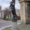 The sculpture "Boy with a Galosh," located on Basanavičius Street in Vilnius, is a tribute to the world-renowned writer Romain Gary, who was born and raised in this city. Created by sculptor Romualdas Kvintas, the piece was inspired by Gary’s autobiographical novel "Promise at Dawn," in which he describes his childhood in Vilnius and his mother’s unconditional love.