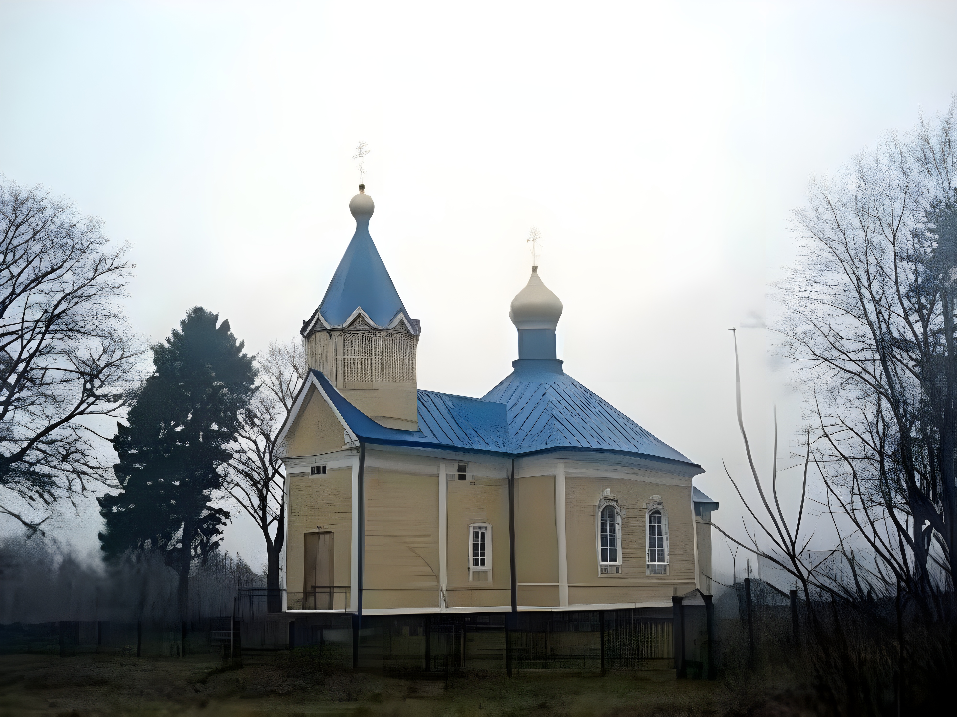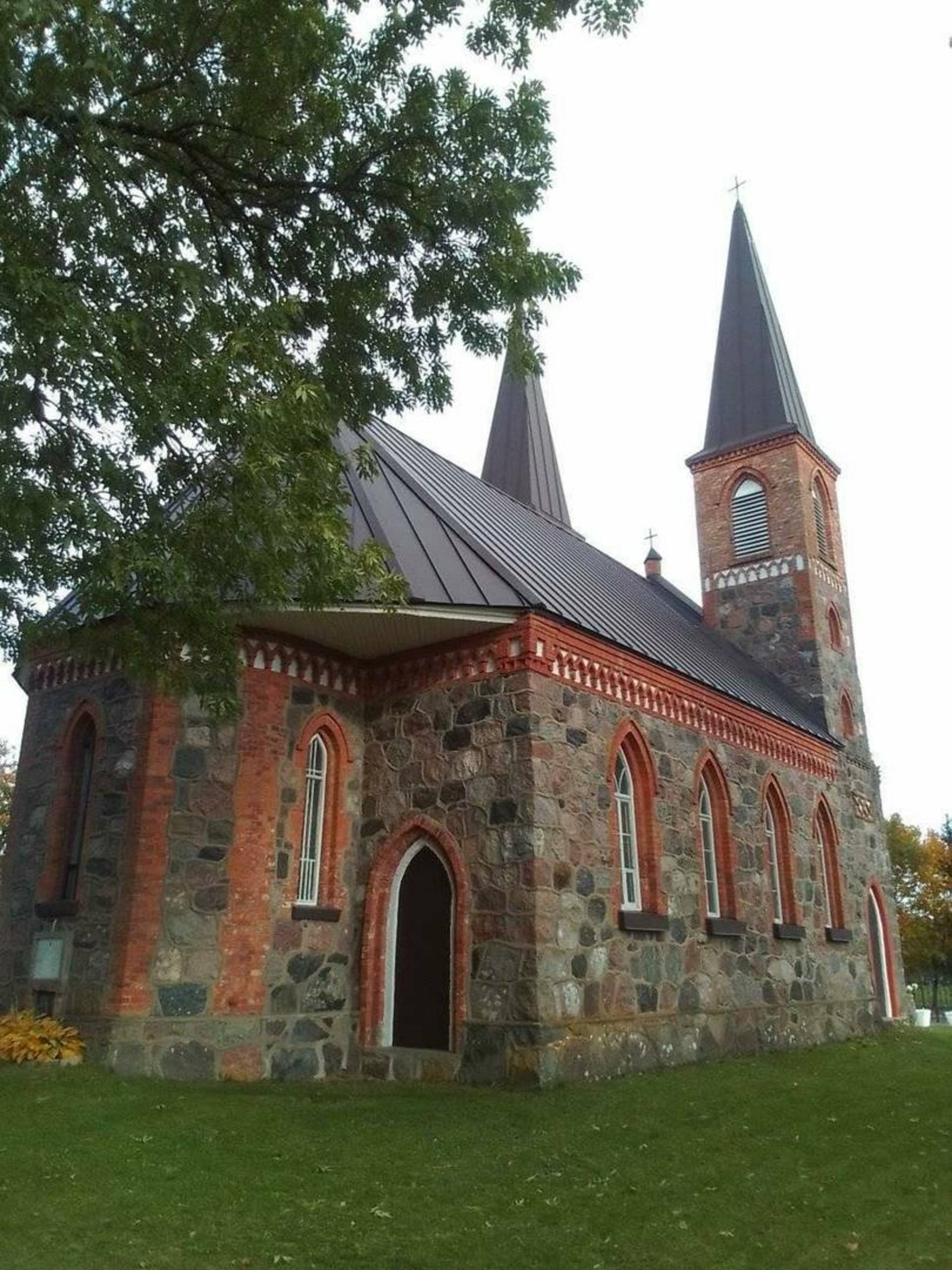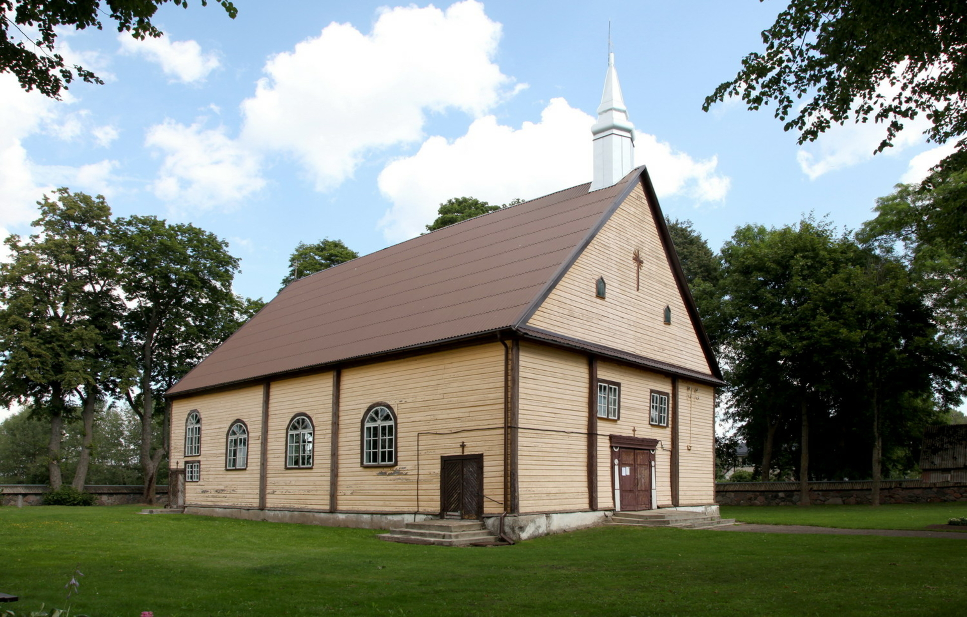 The church is located in the town of Šaukėnai, on the right bank of the Šona River (a tributary of the Venta). Šaukėnai Church is mentioned as early as 1497. The church has been rebuilt several times. The current wooden, framed church was built in 1947. The church has a rectangular plan with 2 spires. The churchyard fence is made of wooden structures with masonry arched gates. The churchyard gates are included in the list of protected cultural monuments. The 18th-century bell tower has been preserved.