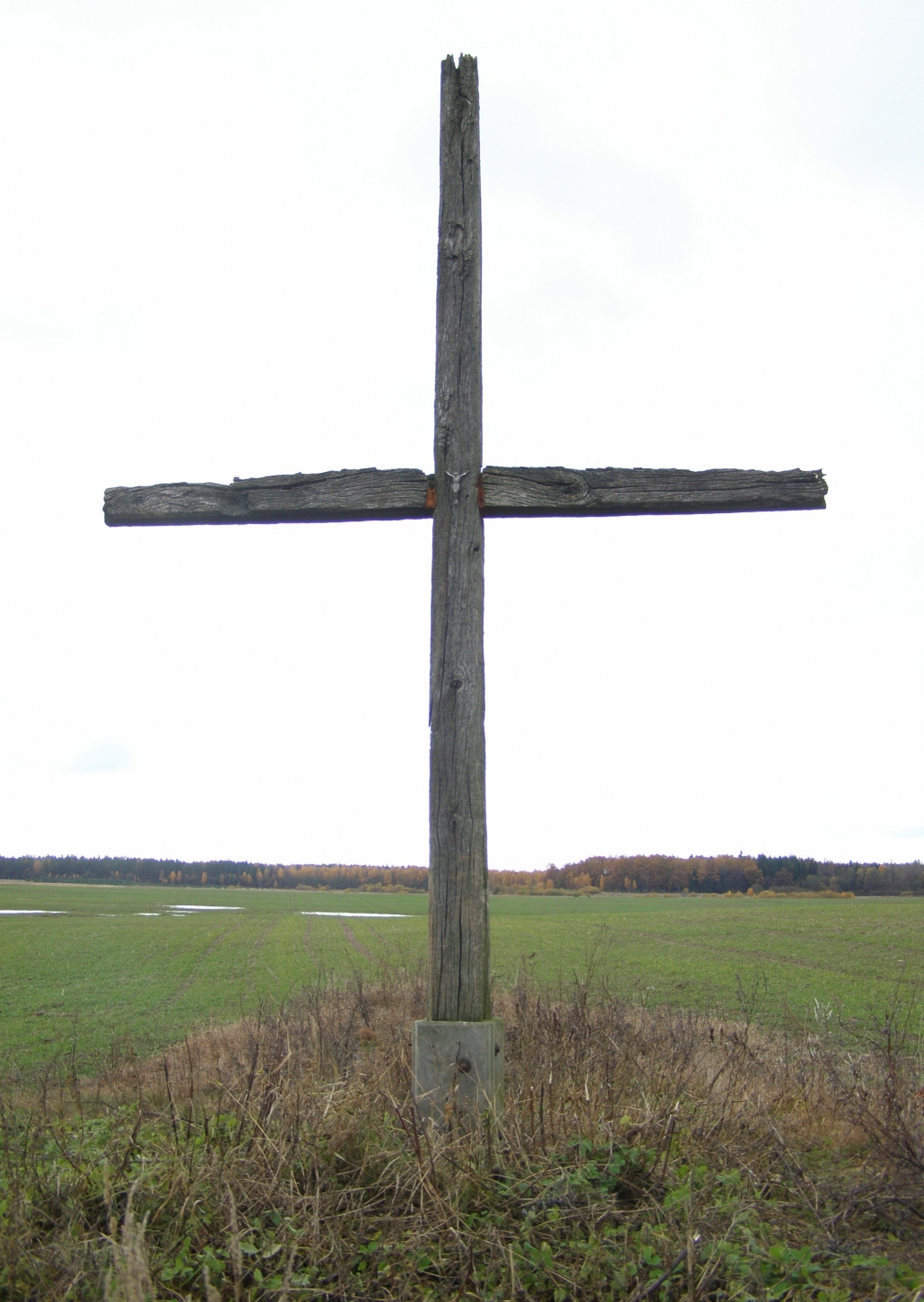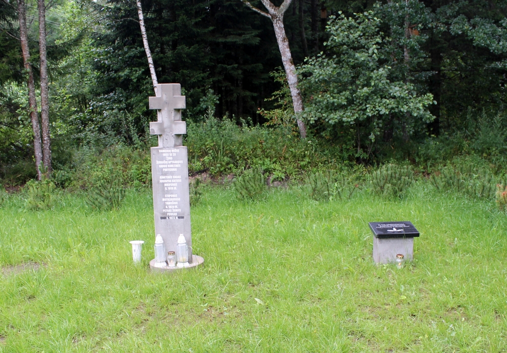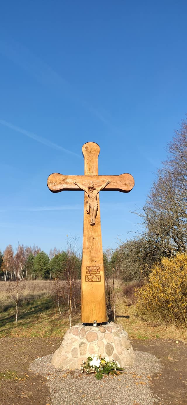 paminklinė plokštė, pagerbianti paskutinįjį Žemaičių apygardos ir Kardo rinktinės partizaną Praną Končių. Jis gyveno šioje vietoje 1956–1965 m. ir žuvo 1965 m. liepos 15 d. Kryžių 2003 m. pastatė Kartenos kovų už Nepriklausomybę įamžinimo draugija, vadovaujama Juozapo Antano Vilucko, o meistras Antanas Rudelis. Paminklinė plokštė atidengta 2014 m. liepos 19 d. Lietuvos kariuomenės vado, generolo leitenanto Arvydo Pociaus iniciatyva, ją sukūrė meistras Pranas Jucys.